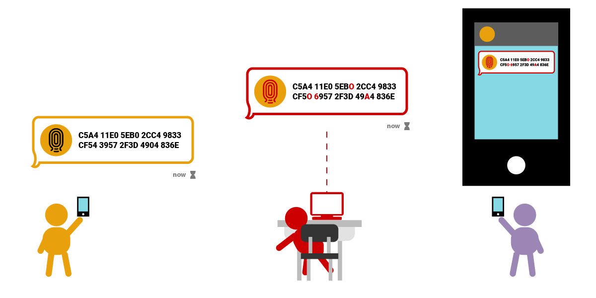 စမတ်ဖုန်းတွေကိုင်ထားတဲ့ လူနှစ်ယောက်။ ဘယ်ဘက်လူက သူ့ရဲ့ အများသုံး စကားဝှက်သော့လက်ဗွေကို ချက်တင်ကနေ ပို့လိုက်ပါတယ်။ ညာဘက်လူဆီ မရောက်ခင်မှာပဲ အလယ်မှာရှိတဲ့ လူက ပေးပို့သူရဲ့ မက်ဆေ့ချ်ကို ကြားဖြတ်ယူပြီး လက်ဗွေမှာ ပါရှိတဲ့ ကိန်းဂဏန်းနဲ့စာလုံး အချို့ကို အပြောင်းအလဲလုပ် လိုက်ပါတယ်။ ပြီးတော့မှ ညာဘက်က လက်ခံသူ ဆီပို့ပေးလိုက်ပါတယ်။ ညာဘက်မှာ လက်ခံသူရဲ့ဖုန်းကို ပြထားပါတယ်။ မက်ဆေ့ချ်က မူလပေးပို့ သူဆီက လာသလိုထင်ရပေမယ့် တကယ်တမ်းကျတော့ ကြားလူရဲ့စနက်နဲ့ လိမ်ထားတဲ့ မက်ဆေ့ချ် အတုကြီးဖြစ်နေပါတယ်။